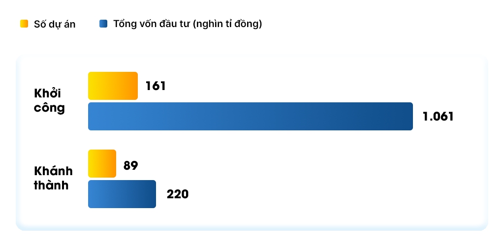 Song đó chưa phải là những con số ấn tượng duy nhất. Trong số 250 dự án, công trình, có 89 công trình được chính thức khánh thành, đưa vào sử dụng và 161 dự án được khởi công xây dựng; gồm 8 dự án quan trọng quốc gia, 46 dự án nhóm A, 155 nhóm B và 41 nhóm C.