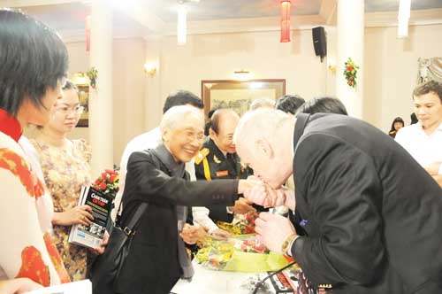 Cựu chiến binh Mỹ Zumwalt bày tỏ sự trân trọng đối với Mẹ Việt Nam anh hùng Bùi Thị Mè - Ảnh: Diệp Đức Minh |