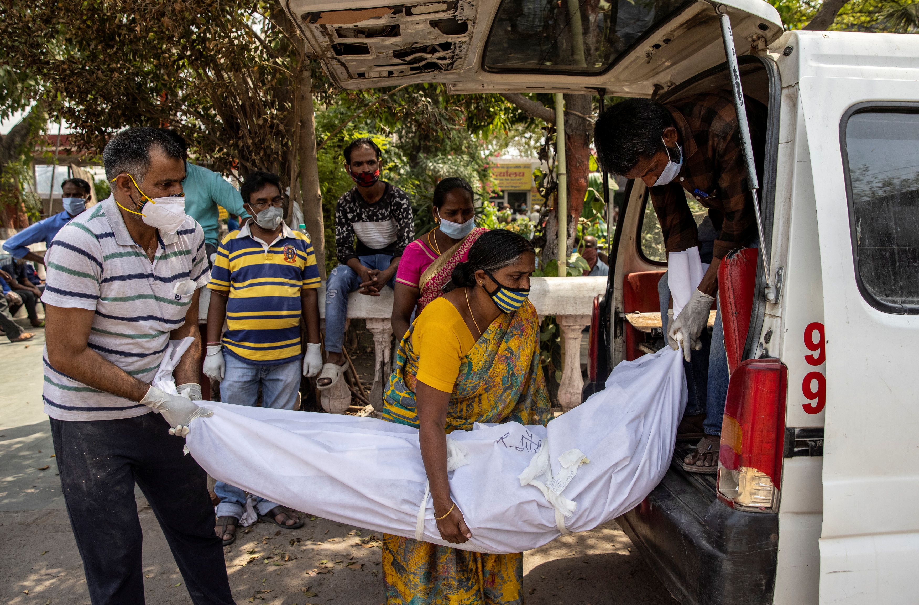 Người thân khiêng thi thể một người chết do Covid-19 đi hỏa táng tại khu hỏa táng ở New Delhi (Ấn Độ). Reuters |