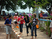 Tháng 4 và 5 là hai tháng nóng nhất trong năm ở Lào, vì vậy người dân tổ chức Tết té nước để cầu mưa và chúc an lành đến tất cả những người thân quen. Sáng 14.4, chúng tôi đổ ra đường trên chiếc xe tuk tuk của bác tài tên Tuấn quê ở Tây Ninh, đã sinh sống tại Lào đến 14 năm mà chúng tôi tình cờ làm quen lúc đặt chân xuống Viên Chăn. Khác với những gì mường tượng, Viên Chăn khá vắng vẻ, nhà cửa đóng kín mít. Dạo quanh một vòng, vẫn không thấy gì khác lạ. "Tết Bum Pi May buồn như thế này ư ?", anh Vĩnh Phương - Báo Thể Thao Việt Nam buột miệng hỏi. Bác tài Tuấn giải thích: "Chưa đâu, người ta vẫn đang còn chuẩn bị, phải đến trưa và xế chiều các anh sẽ thấy...". Nói vậy, nhưng chúng tôi không phải chờ lâu, sau một vòng dạo qua chợ buổi sáng và đến tham quan quảng trường Cayson phomvihan, Tết Bum Pi May bắt đầu hiện diện khắp nơi. Từng nhóm thanh niên, ngồi trên những chiếc xe tải nhỏ với đầy đủ dụng cụ chứa nước: xô, thùng, thau, ca và cả các loại súng nước đang rong ruổi tìm mục tiêu. Đang mải mê ngắm nhìn, bất chợt "ào ào" - nguyên một xô nước lớn té vào người tôi, nước bắn tung tóe, ướt sũng. Sau một thoáng bất ngờ là cảm giác mát đến tuyệt vời, bởi chúng tôi đang đi giữa cái nắng khủng khiếp hơn 40 độ C của những ngày đầu hạ. Rất may là điện thoại và máy ảnh của chúng tôi chẳng hề hấn gì vì đã được gói kỹ trong túi ni-lông. Dừng lại góc phố Luangprabang, nơi các cô gái trẻ đang vui đùa, té nước vào khách đi đường, chúng tôi được mời một cốc bia nhân dịp "Happy new year Lào". Vừa cầm ly đưa lên miệng, lại “ào, ào, ào”..., bia và nước được tưới khắp người chúng tôi. Tất cả đều cười vui vẻ, vì theo tục lệ càng được té nước chúc phúc nhiều thì càng có nhiều may mắn và an lành. Các bạn trẻ Lào vui Tết khá hay. Họ tập trung từng nhóm bạn thân, ở công viên hay bên vệ đường, mở nhạc thật lớn, vui nhảy và cùng nhau té nước. Nhiều người còn cầm cả vòi nước tưới cây giữa công viên để xịt vào bạn bè. Bất cứ thứ gì là nước đều được té lên người nhau, vì vậy mà chẳng mấy chốc áo quần nhem nhuốc đủ màu, nhưng cũng chẳng mấy chốc, tất cả đều được nước dội sạch.