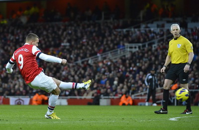 BÀN THẮNG. Cuối cùng Arsenal cũng đã có bàn mở tỷ số. Lukas Podolski là tác giả của bàn thắng từ pha sút phạt.