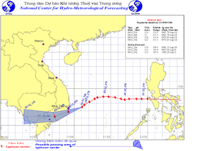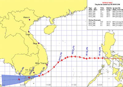 Dự báo trong 24 giờ tới, bão di chuyển theo hướng tây tây nam, mỗi giờ đi được khoảng 15 - 20km. Tính từ tâm bão, vùng gió mạnh nguy hiểm từ cấp 6 trở lên có bán kính khoảng 200 - 250km. Như vậy, bão ảnh hưởng trực tiếp đến các tỉnh ven biển từ Phú Yên đến Sóc Trăng. Khoảng đêm 4/12, vùng tâm bão có khả năng đi vào địa phận các tỉnh từ Bình Thuận đến Bến Tre. Đến 16h ngày 5/12 vị trí tâm bão ở vào khoảng 10,5 độ vĩ bắc; 106,4 độ kinh đông, trên địa phận các tỉnh đồng bằng Nam Bộ.