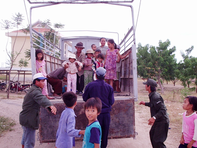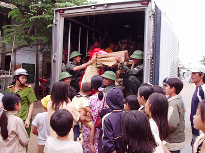 Trẻ em và người già lên xe đến nơi an toàn tránh lũ quét khi bão đến |