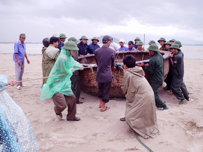 Bộ đội giúp dân đưa thúng nghề lên bờ (Ảnh Thiện Nhân, chụp lúc 13h ngày 4/12) |