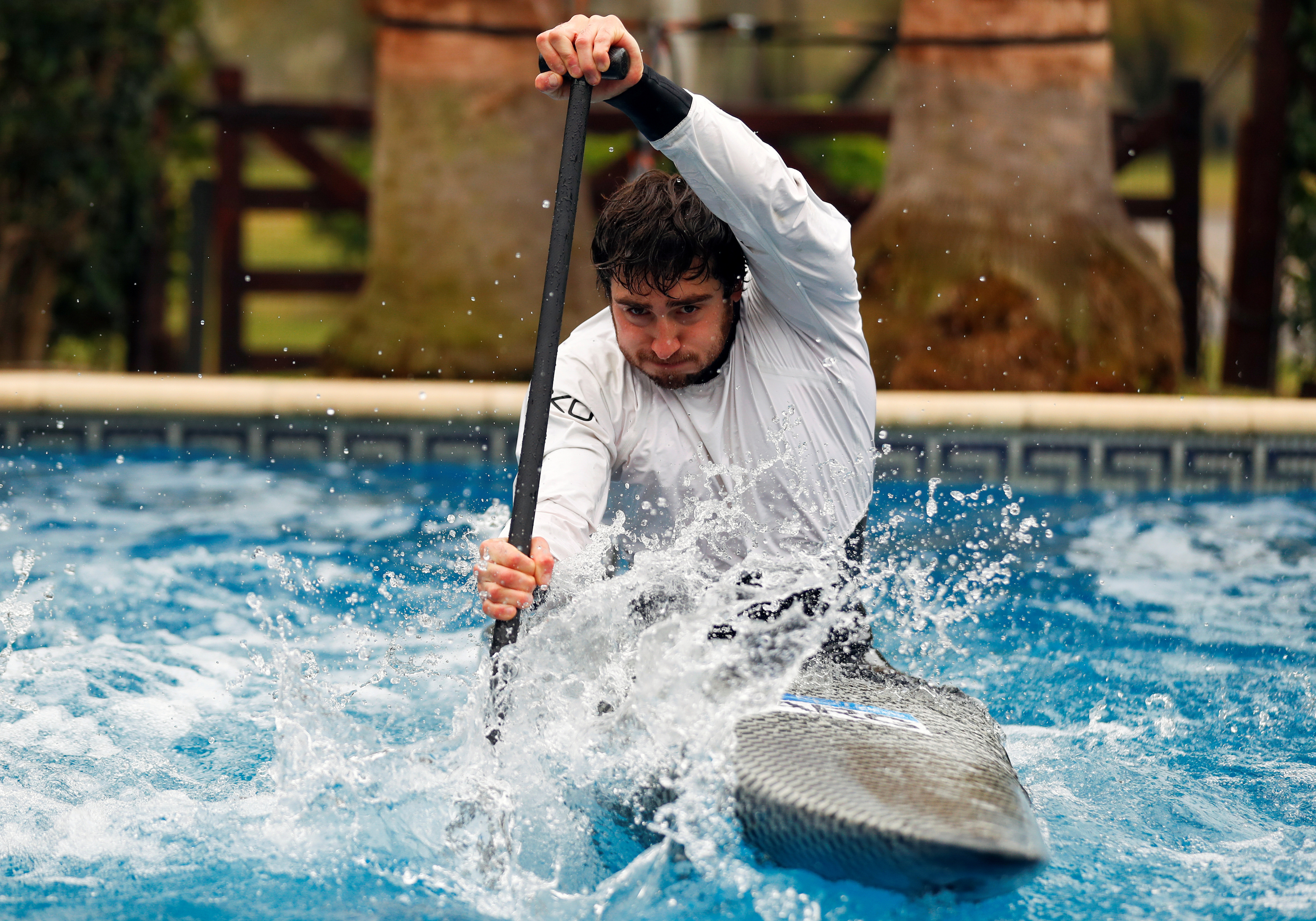 Vận động viên đua thuyền Sebastian Rossi phải luyện tập trong bể bơi vì Covid-19. Reuters |