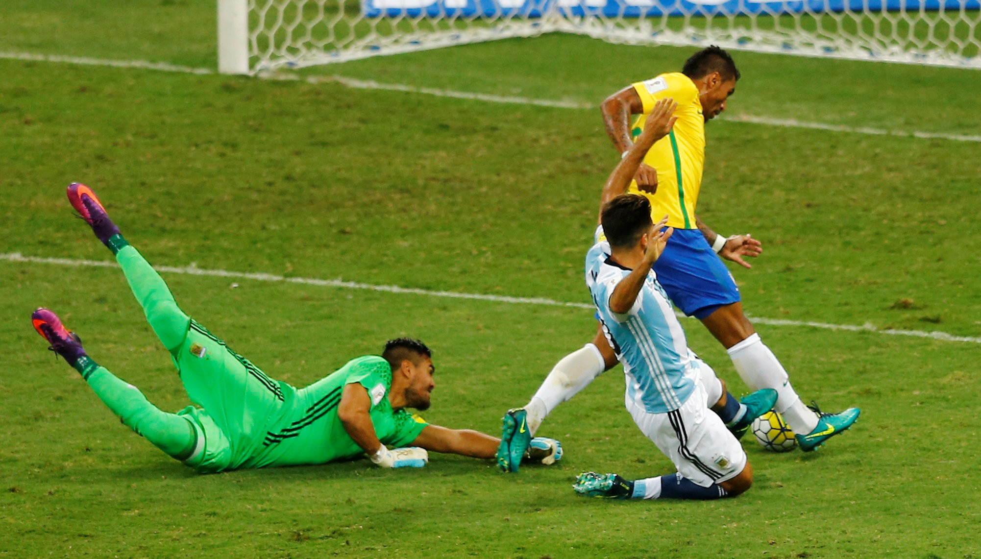 NGUY HIỂM. Paulinho đi bóng trong vùng cấm địa, qua cả thủ môn Romero rồi dứt điểm nhưng Zabaleta đã kịp lui về phá bóng trước vạch vôi khung thành Argentina - Ảnh: Reuters