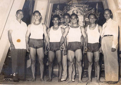 Ông Nguyễn Chánh Minh (bìa trái) và các học trò tại Hội thi Lực sĩ đẹp năm 1958 |