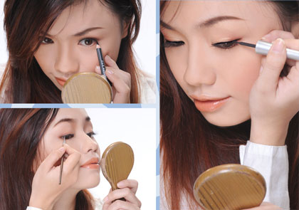 Khi vẽ phải dùng cọ lông có đầu dài và mềm nhúng vào nước, tùy theo bạn muốn màu viền đậm hay nhạt mà quét nhiều hay ít bột màu mắt. Dạng viền mí này cũng dễ sử dụng, độ nét cao hơn chì. Vì sử dụng bằng nước và cọ lông mềm nên rất dễ kéo viền mí, phù hợp với những người có mí mắt hơi nhăn. Khi vẽ, một tay căng mí hoặc đuôi mắt để bảo đảm bột màu đều và đẹp (hình 2).