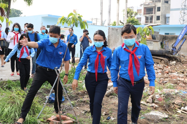 Bí thư thứ nhất T.Ư Đoàn Nguyễn Anh Tuấn (bân phải) tham gia khởi công xây dựng sân chơi cho thiếu nhi và trồng cây xanh tại P.Hiệp Bình Phước, TP.Thủ Đức, TP.HCM vào ngày 8.5 Thanh Vương
