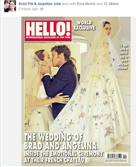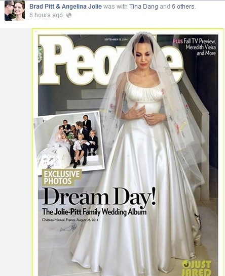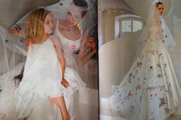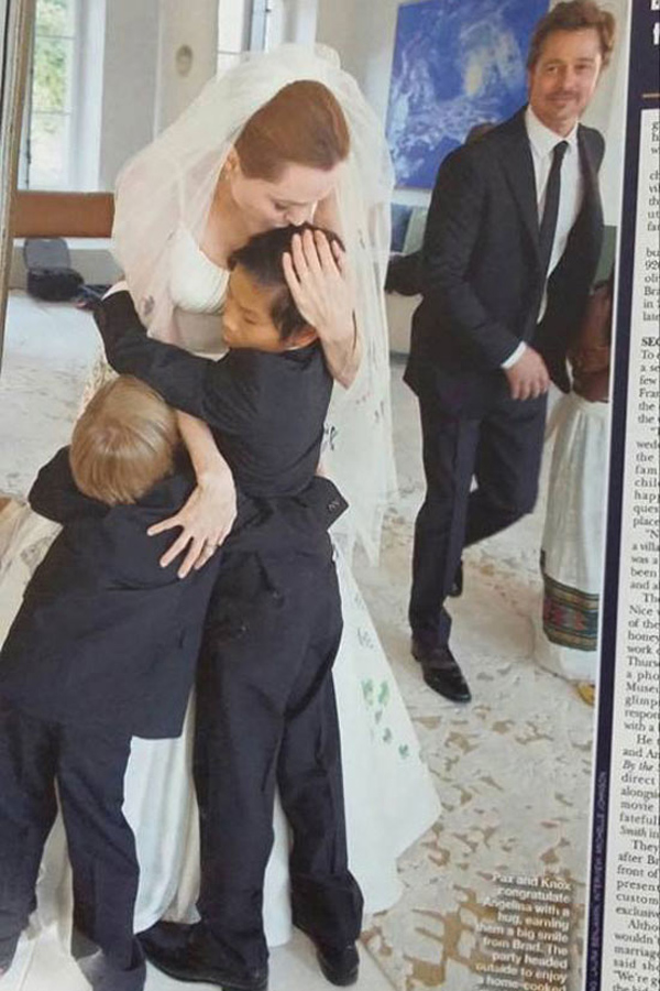 Được biết, Jolie-Pitt quyết định kết hôn vì các con. Chia sẻ về chiếc áo cưới, Jolie nói với tạp chí Hello: "Tôi muốn những đứa trẻ là một phần của tất cả mọi thứ, bao gồm cả trang phục. Vì đó là gia đình của chúng tôi, biểu hiện cách chúng ta sống cuộc sống cùng với nhau".
