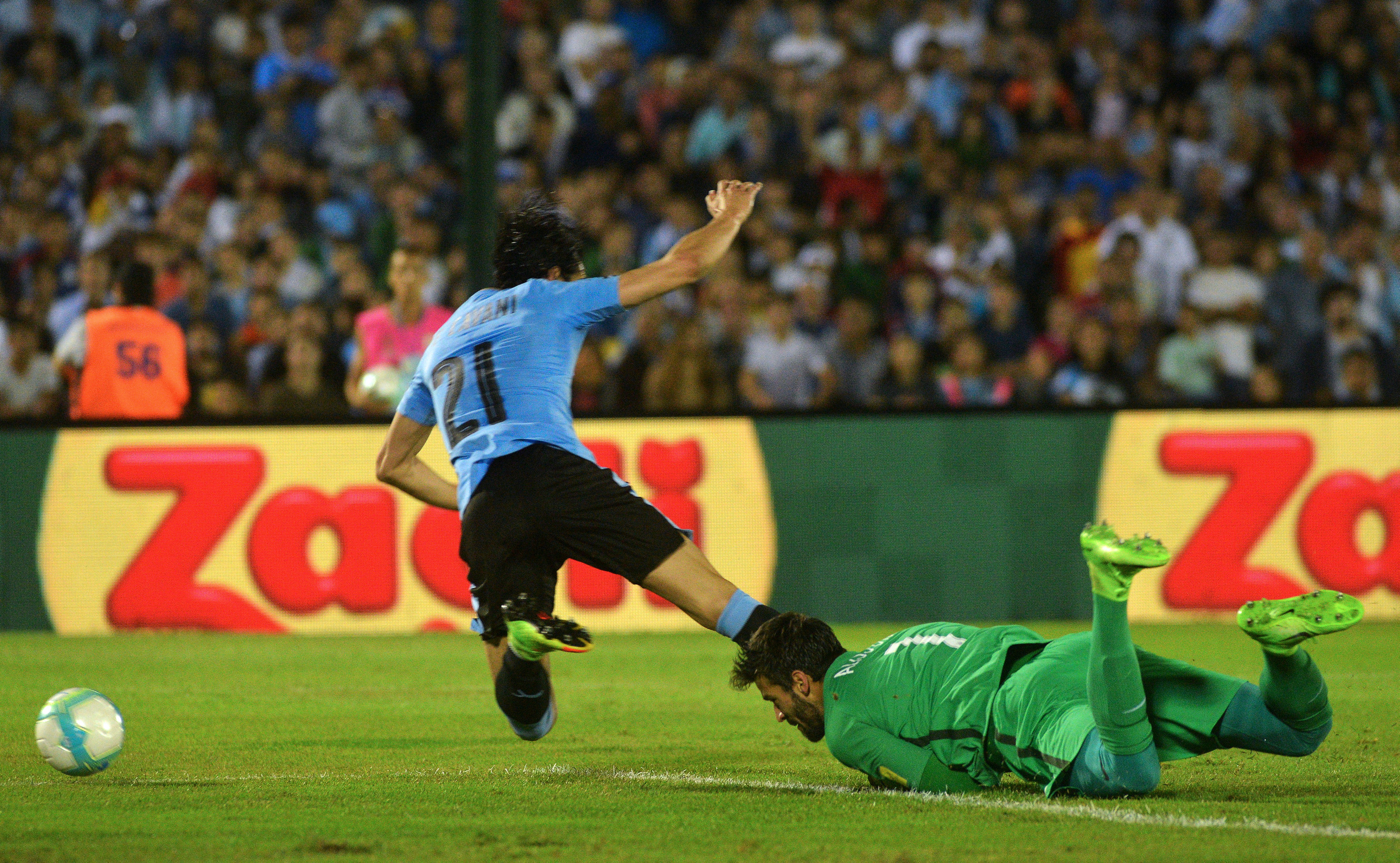 PHẠT ĐỀN cho Uruguay. Đường chuyền về tai hại của Marcelo đã bị Cavani cướp được và anh này đối mặt với thủ môn Alisson rồi bị thủ môn này phạm lỗi trong vùng cấm địa - Ảnh: Reuters