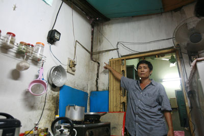 Chúng tôi có mặt tại khu vực cầu Ông Cậy, thuộc địa phận ấp Cây Bàng 1 và 2, P.Thủ Thiêm (Q.2) vào chiều ngày 26.6 khi trời mưa tầm tã. Ở khu vực này, có ít nhất 14 căn nhà bị lún nền, từng mảng tường bị xé toạc. Do nước xoáy, một số căn đã bị sạt lở gần hết phần móng, chỉ còn trơ trọi vài trụ bê tông hoặc cừ tràm, nguy cơ sụp đổ có thể xảy ra bất kỳ lúc nào.