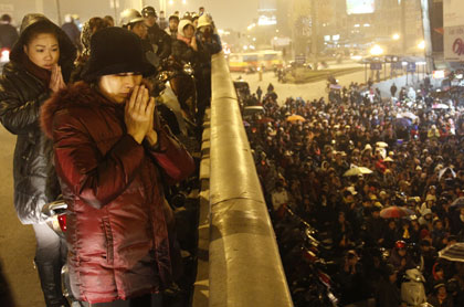 Dưới đường không còn chỗ, nhiều người chắp tay đứng khấn vái từ trên cầu vượt Ngã Tư Sở…
