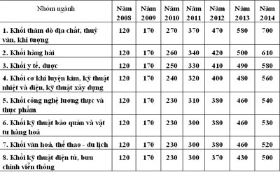 Khung học phí đại học trần của các nhóm ngành đào tạo đại trà giai đoạn 2009 - 2014