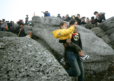 Những bức ảnh dưới đây được chụp trong ngày mùng 3 tết Tân Mão, tức 7 ngày trước lễ khai hội Yên Tử. Chưa vào chính hội, nhưng du khách về Yên Tử đã khá đông, có lúc tạo ra cảnh ùn ứ trên đường hành hương.