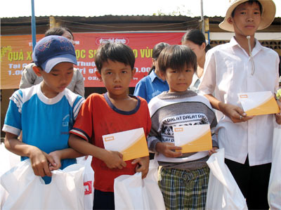 500 phần được trao đợt 1 trong tổng cộng 1.000 phần quà chở nặng tình cảm của tập thể nhân viên công ty Nutifood, phối hợp cùng Thành đoàn Tp HCM, Báo Tuổi trẻ, đã được trao tặng đến tận tay các em nhỏ vùng bão Cần Giờ. Mỗi gói quà xuân trị giá 200.000 đồng gồm tiền mặt và bánh tết, dù nhỏ, nhưng cũng đủ để sưởi ấm những mảnh đời còn nghèo khó, thiếu thốn vì thiên tai…