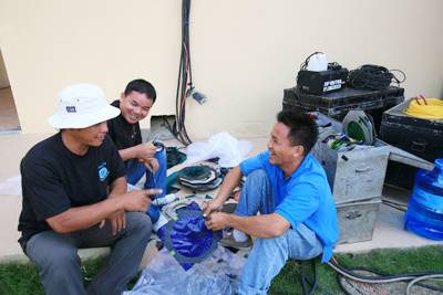 Các kỹ thuật viên ánh sáng đang thảo luận |