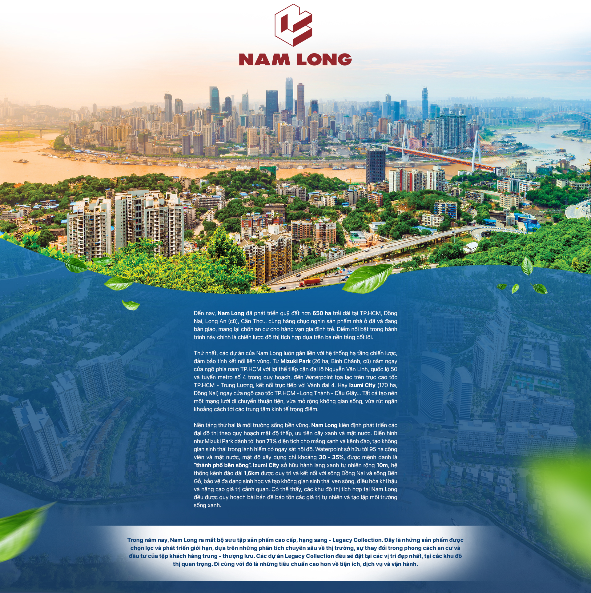 Chúng tôi sẽ tiếp tục phát triển mô hình đô thị tích hợp nhưng nâng cấp với ba trọng tâm: thiết kế bền vững, cộng đồng bền vững, kết nối liền mạch. Với các dự án hiện hữu, chúng tôi không ngừng nâng cấp hệ sinh thái dịch vụ, tiện ích, vận hành để nâng cao chất lượng sống dài hạn cho cư dân.