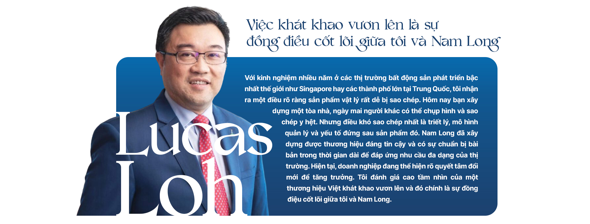 Ông Lucas Loh: Tôi nhận thấy rằng VN đang trong giai đoạn đô thị hóa nhanh, tầng lớp trung lưu gia tăng mạnh, dẫn đến nhu cầu cao về nhà ở và các tiện ích tích hợp trong đô thị. Điều này giống với thời kỳ bùng nổ bất động sản tại Singapore thập niên 1990 và Trung Quốc đầu những năm 2000. Tuy nhiên, so với Singapore hay Trung Quốc, nơi tôi từng có hơn 20 năm làm việc, Việt Nam vẫn còn thiếu các khu đô thị với đầy đủ các tiện ích, hệ sinh thái khép kín.