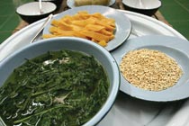 Mâm cơm với canh rau rớn, ca la thầu và gạo rang |