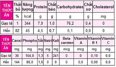 Theo Viện Dinh dưỡng quốc gia, cơm và hến có thành phần dinh dưỡng (tính trên 100g thực phẩm ăn được) như trong bảng dưới đây, còn các loại rau cung cấp rất dồi dào các chất khoáng và vitamin.