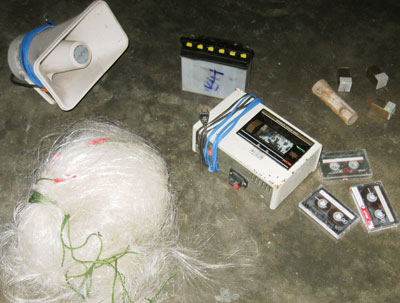 Chúng tôi tìm đến nhà anh Nguyễn Văn Tám ở xã Bình Kiến, TP Tuy Hòa để tìm hiểu về công nghệ bẫy cuốc bằng lưới. Anh Tám giới thiệu sơ qua những dụng cụ cần thiết cho một chuyến giăng bẫy: một tấm lưới dài 30m, cao 4m; ba cọc tre để giăng lưới, mỗi cọc dài khoảng 6m; 4 chiếc chuông tự chế (giống như chuông người ta bán cà-rem) dùng để mắc vào lưới, sẽ phát ra tiếng kêu khi cuốc dính lưới; đèn pin, bình ắc-quy, máy cassette độ lại với bộ phận khuếch đại âm thanh, kèm theo loa công suất lớn và những cuộn băng cassette ghi âm tiếng kêu của chim cuốc...