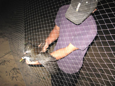Chúng tôi ngồi trong chòi hút thuốc, trò chuyện, bỗng có tiếng kêu leng keng, anh Thanh vừa chạy vừa nói với lại: “Có chim mắc bẫy...”. Đây là con cuốc dính bẫy đầu tiên, lúc đó đã hơn 12 giờ khuya. Thỉnh thoảng lại có tiếng kêu leng keng từ những chiếc chuông... Vì cuối mùa chim di trú nên đêm nay chúng tôi bắt không được nhiều. Anh Tám kể, cách đây hơn một tháng, nhóm của anh giăng bẫy cũng ở địa điểm này, có đêm gặp luồng chim đi, bắt gần cả trăm con. Đa số là chim cuốc, ngoài ra còn bắt được cả vạc, cò, ấp muỗi, cú mèo... Số chim đánh bắt được mang về làm thịt, nếu số lượng nhiều thì đem ra chợ hoặc đến những quán nhậu bán với giá khoảng 8.000-10.000 đồng/con. Theo anh Tám thì bắt đầu vào mùa đông, chim cuốc từ phương Bắc di trú vào Nam để tránh rét. Đồng thời mùa biển động, các loài chim ở ngoài các đảo di trú vào đất liền. Nắm được đặc điểm này mà cánh thợ bẫy chim “hành nghề” đúng vào thời điểm chim di trú.
