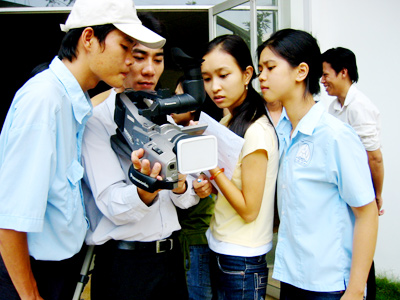 Đây là trường nổi tiếng "âm thịnh, dương suy" nên hầu hết cánh má hồng phải kiêm luôn phần quay phim - việc đáng lẽ phải là của cánh mày râu. Nhưng để được cầm chiếc Camcorder (máy quay) nặng khoảng 3kg thì đó phải là một chuyên gia... "vọc" máy giỏi nhất trong nhóm. "Nói thì nói vậy chứ mấy loại thiết bị này toàn là thứ đắt tiền, nếu vọc bậy bạ là không biết lấy gì để đền nữa! Muốn quay được thành thạo, tụi mình phải chăm chú coi thầy thao tác trước rồi soi kỹ từng nút làm theo, từ từ mới dám xài đấy!", bạn Hoàng Oanh cho biết.
