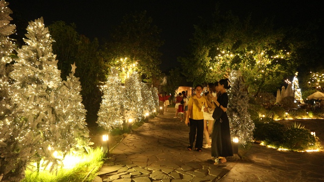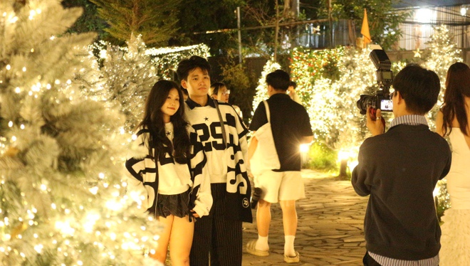 Ghi nhận của người viết cho thấy hầu như khu vực nào trong quán cũng có khách đứng chờ đến lượt chụp hình. Con đường thông tràn ngập không khí Noel trở thành "nền chụp" phổ biến nhất, từ ảnh cá nhân, ảnh đôi đến ảnh nhóm. Bên cạnh đó, cây thông khổng lồ ngay bờ sông được bố trí như một tiểu cảnh trung tâm, kết hợp với nhiều góc chụp khác nhau, khiến khách dễ dàng thay đổi bối cảnh chỉ trong vài bước chân. Khi lên đèn, các lối đi sáng rực bởi hệ thống dây đèn, tạo hiệu ứng lung linh rõ rệt, khác hẳn cảm giác có phần "lạnh lẽo" vào ban ngày.