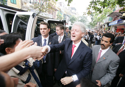 Tuy là cựu Tổng thống, nhưng ông Clinton vẫn được bảo vệ hết sức nghiêm ngặt. Suốt buổi sáng không ai biết ông Clinton làm gì và đi đâu. Khoảng 11 giờ 30, ông Clinton và một số vệ sĩ bất ngờ đi ra khỏi khách sạn Hilton. Ông đã đi bộ dọc qua Nhà hát Lớn, sau đó rẽ vào phố Tràng Tiền rồi đi tiếp ra hồ Gươm. Gặp ai trên đường cựu Tổng thống cũng mỉm cười, chủ động bắt tay chào (ảnh) trong sự ngạc nhiên và thú vị của nhiều người dân. Ra đến bờ hồ Gươm, ông Clinton đã đứng lại rất lâu ngắm nhìn Tháp Rùa. Trên đường đi, ông nói với các phóng viên: "Tôi thực sự hạnh phúc khi quay trở lại VN. Nói thực, tôi rất ngạc nhiên khi chứng kiến sự thay đổi nhanh chóng của VN so với 6 năm trước". |