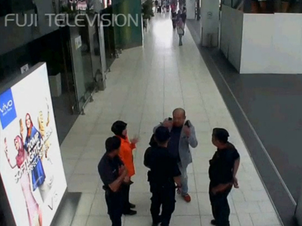 Ông Kim Jong-nam (mặc áo vest) nhờ sự giúp đỡ của nhân viên tại sân bay quốc tế Kuala Lumpur 2 sau khi bị tấn công ngày 13.2 và ông tử vong ngay khi được đưa đi bệnh viện