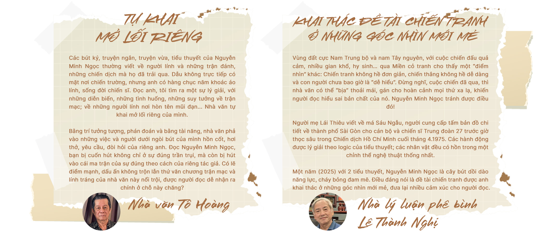 Thêm nữa, lối viết một chiều "ta thắng, địch thua", hễ chính diện thì tốt đều mọi thứ, còn phía phản diện luôn xấu xa, thấp kém…, thử hỏi thắng một đối thủ dưới tầm như vậy thì phỏng có vẻ vang? Tôi chủ động chọn lối đi riêng khi viết về chiến tranh. Có điều không "chép" lại cuộc sống mà là tái tạo hiện thực theo lăng kính thẩm mỹ của mình.