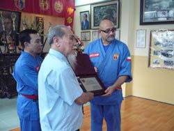 Võ sư chưởng môn Lê Sáng (giữa) nhận quà lưu niệm của đoàn Vovinam Ba Lan |