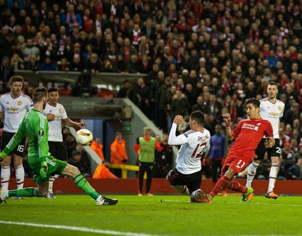 Phút 23, De Gea cản phá xuất thần pha dứt điểm của Philippe Coutinho chỉ cách 1m so với vạch vôi. Đến phút 27, từ cú sút trượt của Daniel Sturridge, hàng phòng ngự của M.U bất lực nhìn bóng lăn trong vùng cấm, Coutinho từ đâu băng vào nhanh như cắt và tung cú dứt điểm. Nhưng De Gea kịp bay người vươn tay cản phá bóng. M.U gần như đã có một bàn thua nếu không nhờ tài gác đền của thủ thành 25 tuổi.