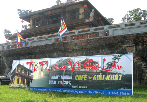 Ngay từ sáng sớm, nhiều người dân ở khu vực quanh kinh thành Huế ngỡ ngàng khi thấy người ta cho dựng bảng hiệu khai trương dịch vụ cà phê, giải khát ngay trong di tích lầu Tứ phương vô sự. Nhưng chỉ sau đó không lâu, tấm bảng đã được gỡ xuống. Tuy nhiên, ở lầu Tứ phương vô sự, cả tầng một và tầng hai, dịch vụ cà phê, giải khát đã đi vào hoạt động. Ngay trên tường thành một hàng cờ ngũ sắc với dòng chữ “Tứ phương vô sự cà phê - giải khát” bay phấp phới.