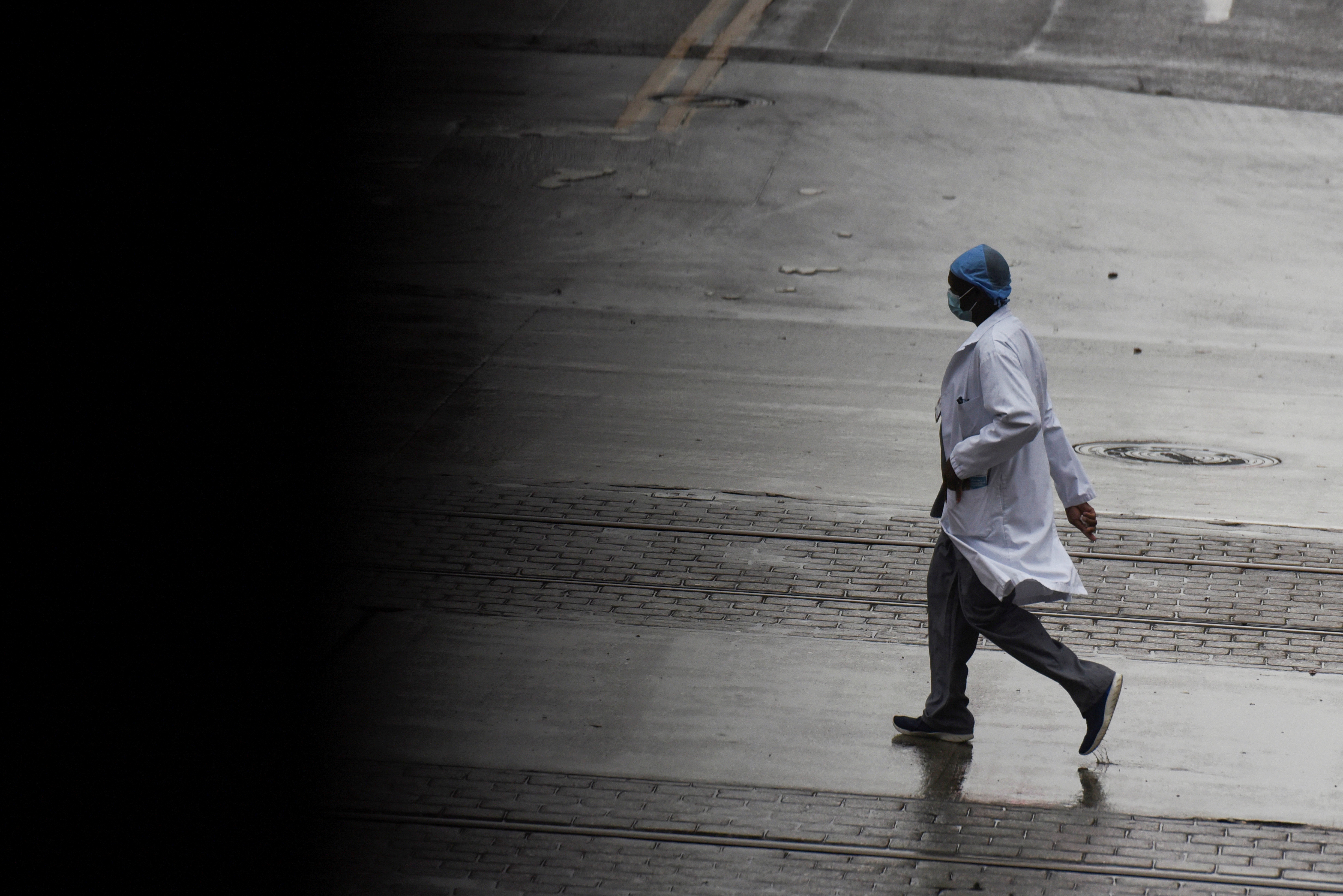 Một nhân viên y tế đến bệnh viện làm việc trong trời mưa bão ở Trung tâm Y tế Texas giữa lúc đại dịch Covid-19 hoành hành tại Mỹ. Reuters |