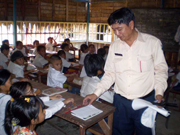Chính những dòng chữ này khiến chúng tôi tò mò và được anh đưa về lớp học ở góc phố TalêSap (Siem Reap). Thật bất ngờ, trong ngôi nhà mái tôn, vách lá, chị Huỳnh Thị Thanh Hằng - vợ anh Sang, tay bế con đang dạy cho mấy chục em nhỏ ê a đọc tiếng Việt...