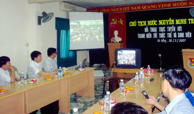 9h sáng, tại Trung tâm Truyền hình Việt Nam tại Cần Thơ, hơn 50 ĐVTN thuộc Chi đoàn Phòng CS Bảo vệ và Hỗ trợ tư pháp Công an TP Cần Thơ (PC 22) cùng Chi đoàn TTTHVN tại Cần Thơ đang chăm chú tham gia buổi trực tuyến. Câu chuyện về những kỷ niệm thời gian tham gia công tác Đoàn của Chủ tịch nước khiến các bạn rất thích thú. Nhiều bạn cho rằng chính những kỷ niệm giản dị ấy của Chủ tịch khiến các bạn cảm thấy Chủ tịch nước của mình thật gần gũi. Bạn Huỳnh Thị Bô Pha - 29 tuổi, quê ở Sóc Trăng, hiện là PV Phòng Khmer của TTTHVN tại Cần Thơ không giấu được tâm trạng háo hức: “Con của mình chỉ mới hơn 6 tháng tuổi nhưng được biết sáng nay có buổi giao lưu trực tuyến với Chủ tịch nước mình đã gửi người nhà trông hộ để tham dự cho bằng đuợc. Sáng nay mình có đến 2 niềm vui: được chính thức kết nạp vào Đoàn và được giao lưu với Chủ tịch nước. Mình hy vọng rằng sau buổi giao lưu này Chủ tịch nước và các bộ ngành sẽ thấy được thuận lợi và khó khăn của cuộc sống cũng như hoạt động xã hội của ĐVTN. Mình mong mỏi nhà nước quan tâm nhiều hơn đến đời sống của ĐVTN, đặc biệt là ĐVTN người Khmer. Có dịp về quê Sóc`Trăng mới thấy đời sống của TN ở đây còn nhiều khó khăn lắm và hoạt động của ĐVTN cũng còn lỏng lẻo. Bởi vậy rất cần được quan tâm để đẩy mạnh hoạt động có hiệu quả cao hơn”. Tại Đà Nẵng, từ 7h sáng, đại diện 29 cơ sở đoàn trực thuộc và toàn bộ BCH Thành đoàn Đà Nẵng đã có mặt tại đầu cầu 02 Yên Báy. Các đoàn viên thanh niên trong màu áo xanh của Hội LHTN Việt Nam chăm chú theo dõi cuộc trực tuyến qua màn ảnh rộng giữa hội trường. Tất cả cùng chia sẻ cảm xúc và “ghen tị” với các thanh niên trí thức trẻ và sinh viên đang đặt câu hỏi trực tiếp với chủ tịch nước tại đầu cầu Hà Nội. Gần như bạn trẻ nào ở đây cũng mang theo giấy bút để đặt câu hỏi tại chỗ để guư8r đến BTC qua lapyop mang theo hoặc chuyển đến các PV báo Tiền Phong, Thanh Niên, Tuổi Trẻ đang online tại Đà Nẵng. Các trang bị cho giới truyền thông tại đầu cầu này khá chu đáo. Hai đường truyền ADSL, một hotpost không dây, 4 máy desktop, 1 laptop. Đặc biệt một màn hình ngoại cỡ truyền trực tiếp hình ảnh buổi đối thoại tại Hà Nội là tâm điểm chú ý của mọi người. Anh Nguyễn Thanh Quang, Bí thư Thành đoàn Đà Nẵng cho biết: “Hiện bên trong TP Đà Nẵng cũng có nhiều điểm theo dõi cuộc đối thoại này tại một số cơ quan, đơn vị. Cạnh nhiều câu hỏi tại đầu cầu 2 Yên Báy Đà Nẵng còn có rất nhiều câu hỏi do bạn trẻ thành phố trực tiếp gửi đến BTC qua e-mail".