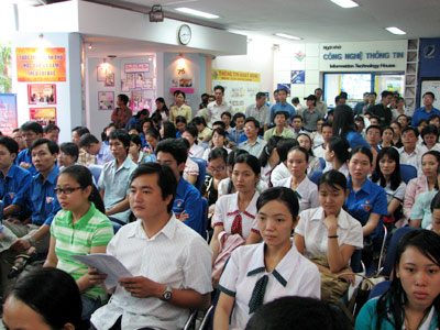 - Thứ trưởng Bộ LĐ-TB-XH Lê Bạch Hồng: Trước khi trả lời câu hỏi này, tôi xin thông tin một chút về tình hình lực lượng lao động ở nước ta. Dân số nước ta khoảng 85 triệu người, trong đó có khoảng 50% lao trong độ tuổi (thanh niên chiếm khoảng 42 - 43%). Tính đến cuối năm 2006, tỷ lệ lao động qua đào tạo là khoảng 29%, trong đó đào tạo nghề khoảng 19%, còn lại là đào tạo cao đẳng, đại học. Bức tranh lao động của chúng ta là tương đối trẻ so với thế giới. Thế nhưng, lực lượng qua đào tạo lại thấp so với thế giới và nhất là trong khu vực. Do vậy, vấn đề giải quyết việc làm gắn liền với đào tạo nghề và giáo dục cao đẳng, đại học.