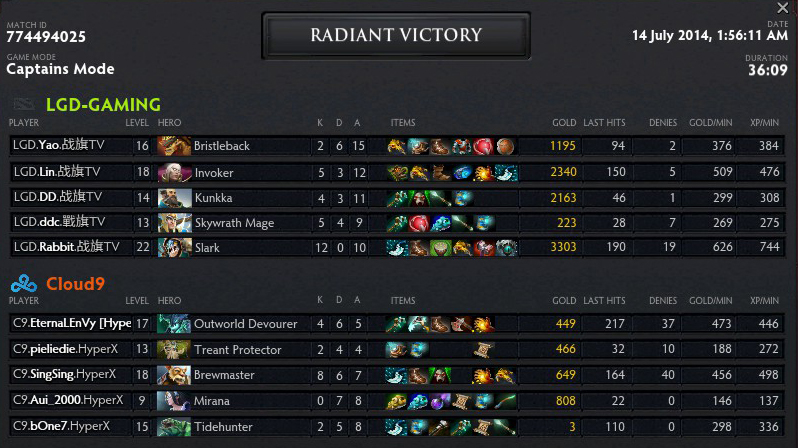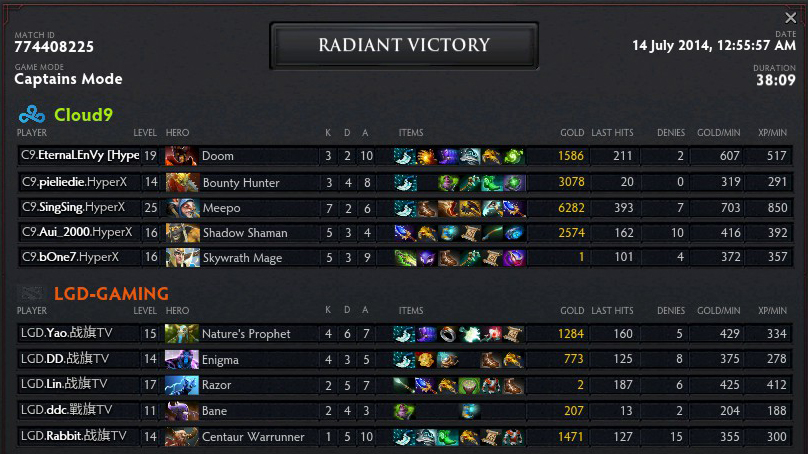 Chiến thuật mới lạ của Cloud9 đã phát huy hiệu quả khi nó khiến LGD tỏ ra cực kỳ lúng túng, đại diện đến từ Trung Quốc liên tục để cho Meepo của Singsing có được mạng cũng như lượng farm cần thiết. Nhận thấy không thể ngăn cản Cloud9 được nữa, LGD quyết định "gg" sau 38 phút thi đấu tương đối một chiều.