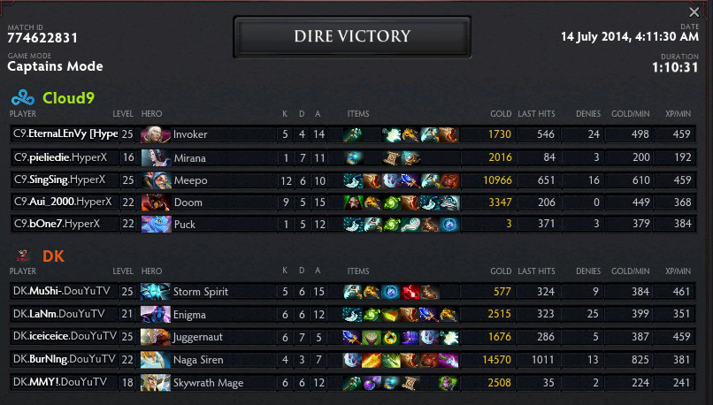 Những phút cuối của trận đấu, khi bóng của Naga trở nên quá mạnh đối với các hero bên phía Cloud 9, DK quyết định tung đòn kết liễu về phía Cloud 9, kết thúc ván đấu dài tới 70 phút đồng hồ.