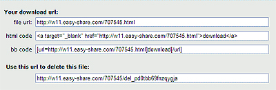 Địa chỉ download file sẽ nằm trong hộp file url. Nếu có website riêng, bạn có thể gắn đoạn mã để tải file đó trong hộp html code vào website của bạn. Nếu bạn không muốn người khác tải file này nữa, bạn có thể huỷ file bằng cách truy nhập địa chỉ được cho trong hộp Use this url to delete this file là xong (bạn sẽ thấy dòng chữ thông báo là File was deleted).