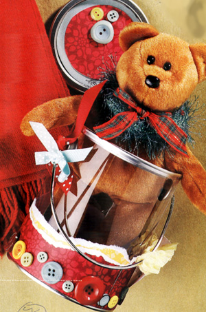 7. Trẻ em rất thích gấu bông, nhưng nếu bạn có cách gói quà đặc biệt, chúng sẽ càng vui hơn. Hãy đặt chú gấu bông nhỏ (hay món đồ chơi nhỏ nào đấy) vào chiếc lọ thủy tinh. Dán giấy hoa xung quanh phần thân giáp đáy lọ và đính những chiếc nút đủ màu lên đó nhé!