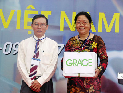 Cũng tại buổi lễ sáng nay, ông Trần Thế Hoàng Dũng - Giám đốc nhà máy Grace Việt Nam, đã trao tặng cho cô Nguyễn Thị Thu Hồng - Phó hiệu trưởng trường THCS Nguyễn Hồng Đào (Hóc Môn), các thiết bị khoa học mới dùng trong việc giảng dạy cho khoảng 900 em học sinh tại trường.