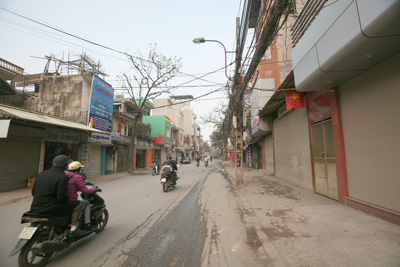 Phố vắng, thưa thớt người qua lại. Các cửa hiệu đều đóng cửa không bán hàng.