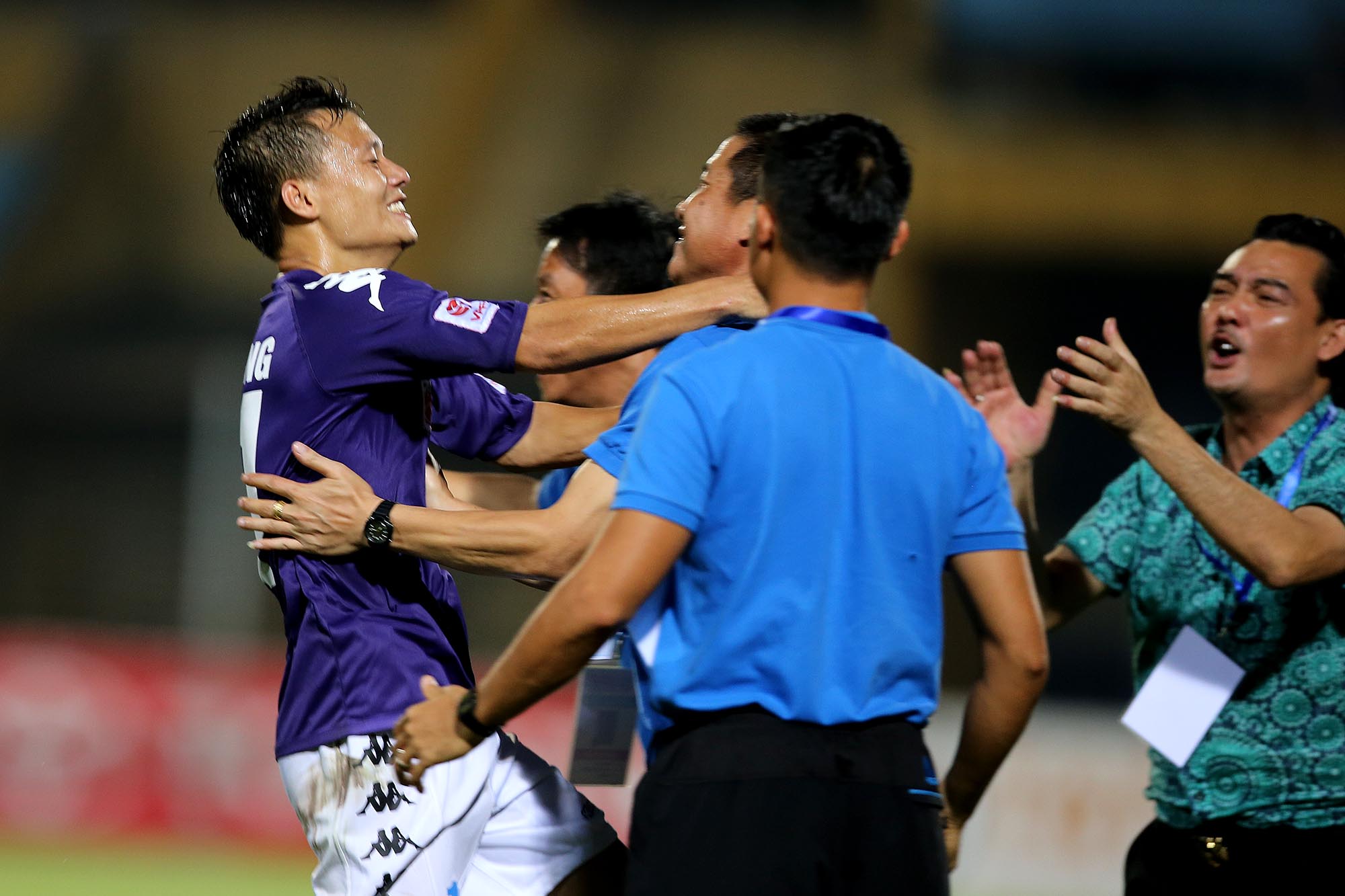Thành Lương ôm chầm HLV Chu Đình Nghiêm sau khi bàn thắng cho Hà Nội T&T - Ảnh: Minh Tú