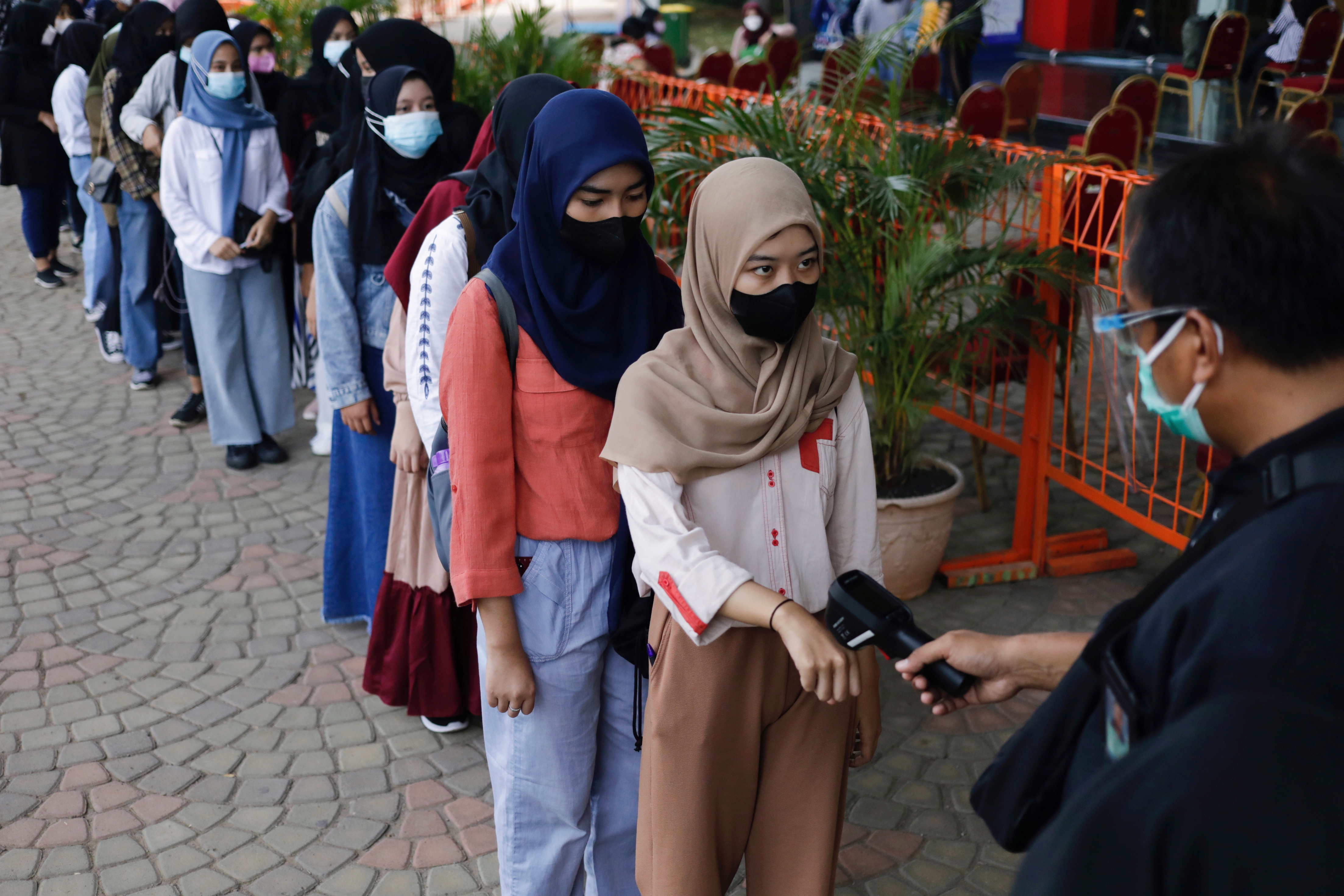 Trẻ em Indonesia xếp hàng trước khi tiêm vắc xin Covid-19. Reuters |