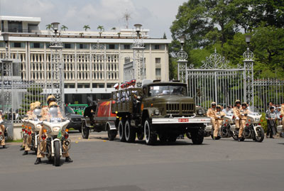 Xe chở linh cữu nguyên Thủ tướng Võ Văn Kiệt rời dinh Thống Nhất - Ảnh: Diệp Đức Minh |