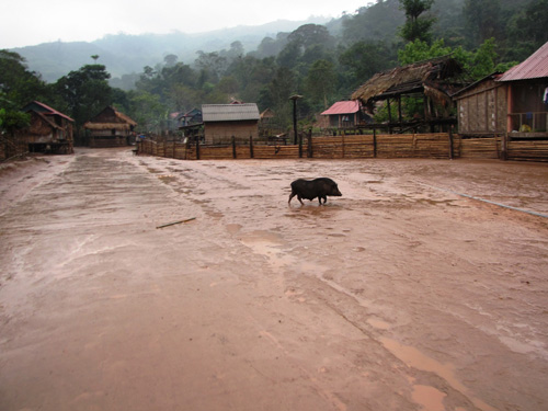 4. Rời A Rem, còn 16 cây số đầy thử thách với chúng tôi phía trước trên hành trình đến cực tây tỉnh Quảng Bình. Cánh cửa chiếc u-oát đánh "rầm", khép lại thời gian nghỉ ngơi, âm thanh ràn rạt từ cần gạt nước cũ lại vang lên quen thuộc. Chạy hơn 30 phút, xe chúng tôi bắt đầu lăn bánh trên phần đất xã Thượng Trạch - nơi khó khăn không kém Tân Trạch. Nếu rẽ trái theo hướng vào cửa khẩu Cà Roòng thì sẽ gặp biên giới Việt - Lào tại Km 61, nhưng chúng tôi chọn cách đi thẳng. Ở đó có tộc người Ma Coong sinh sống. Đoạn còn lại, dự án cải tạo đường đang triển khai, nước mưa xuống khiến cho mặt đường trơn trượt. Chiếc xe cứ xoay ngang khiến anh Hải phải ghì vô-lăng lại như muốn ghì cả chiếc xe khỏi trượt ngược. Vật lộn hơn 1 tiếng thì bản làng Ma Coong dần hiện ra với mái tôn đỏ thấp thoáng.