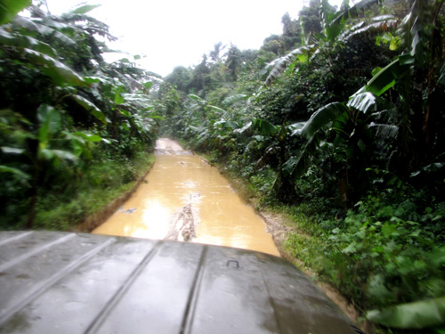 2. Thực ra, bắt đầu từ Km16 - nơi có di tích lịch sử hang Tám Cô - đường mới bắt đầu xấu. Chỉ có loại xe u-oát mới "trị" được con đường này, "nhưng quan trọng là ai điều khiển chiếc xe" - anh tài xế tên Hải nói đùa mà là thật. Mưa rừng khiến cho bề mặt đất, đá càng thêm trơn trượt; một chuyến đi không chờ đón sự êm ả với chúng tôi phía trước. Chiếc xe liên tục lắc lư bên trái bên phải, dồi lên trên rồi tụt xuống dưới, khi lại nhảy như cóc, dù gồng mình né tránh hết cỡ nhưng một số thành viên trong đoàn cũng không khỏi bị va đầu vào thành và trần xe. Khi đi trời rét tê tái, "bị dần" chừng 10 cây số thì trong người nóng bừng bừng, có người phải cởi bớt áo ấm. Nói như anh Hải, chỉ có những tài xế quen đường mới có thể lướt "êm" được trên dạng đường này, chỗ cần nhanh mà đi chậm hay ngược lại đều phản tác dụng, gây trở ngại cho người cầm lái. Vòng vô-lăng liên tục xoay tròn, tôi nhìn qua đồng hồ chỉ tốc độ thì thấy kim nằm ở gần vạch số 0, thỉnh thoảng nhích lên một tí liền hỏi: "Công-tơ-mét bị đứt rồi hả anh?", "Đâu, tốc độ chừng đó chứ mấy, chạy thế này chỉ hơn người đi bộ chút thôi" - anh Hải trả lời. Xoay vô-lăng, giật số, gài cầu, anh Hải thực hiện không phút nghỉ ngơi.